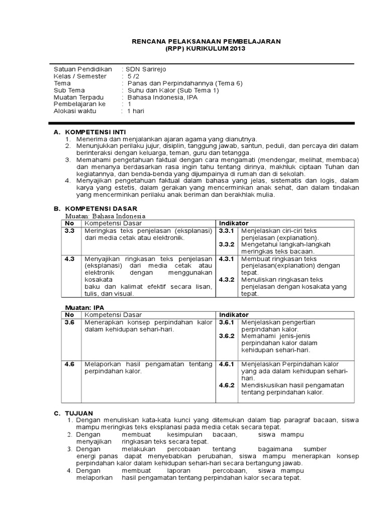 Panas dan perpindahannya subtema 1 : rpp kelas 5. Bahasa indonesia, ipa & sbdp pembelajaran :
